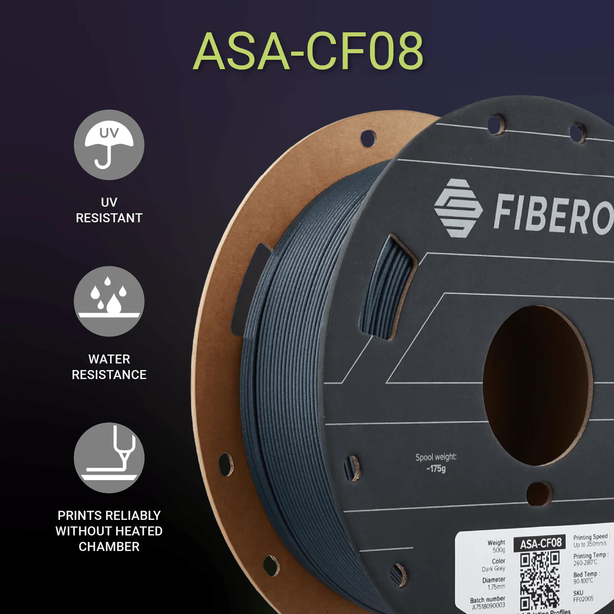 ASA-CF08 stöder höghastighetsutskrift upp till 350 mm/s, är mindre benägen att warpa och kräver minimal uppvärmning av kammaren, vilket gör det till ett mångsidigt val för både proffs och hobbyanvändare.